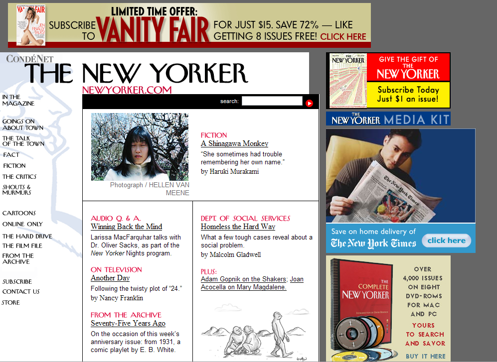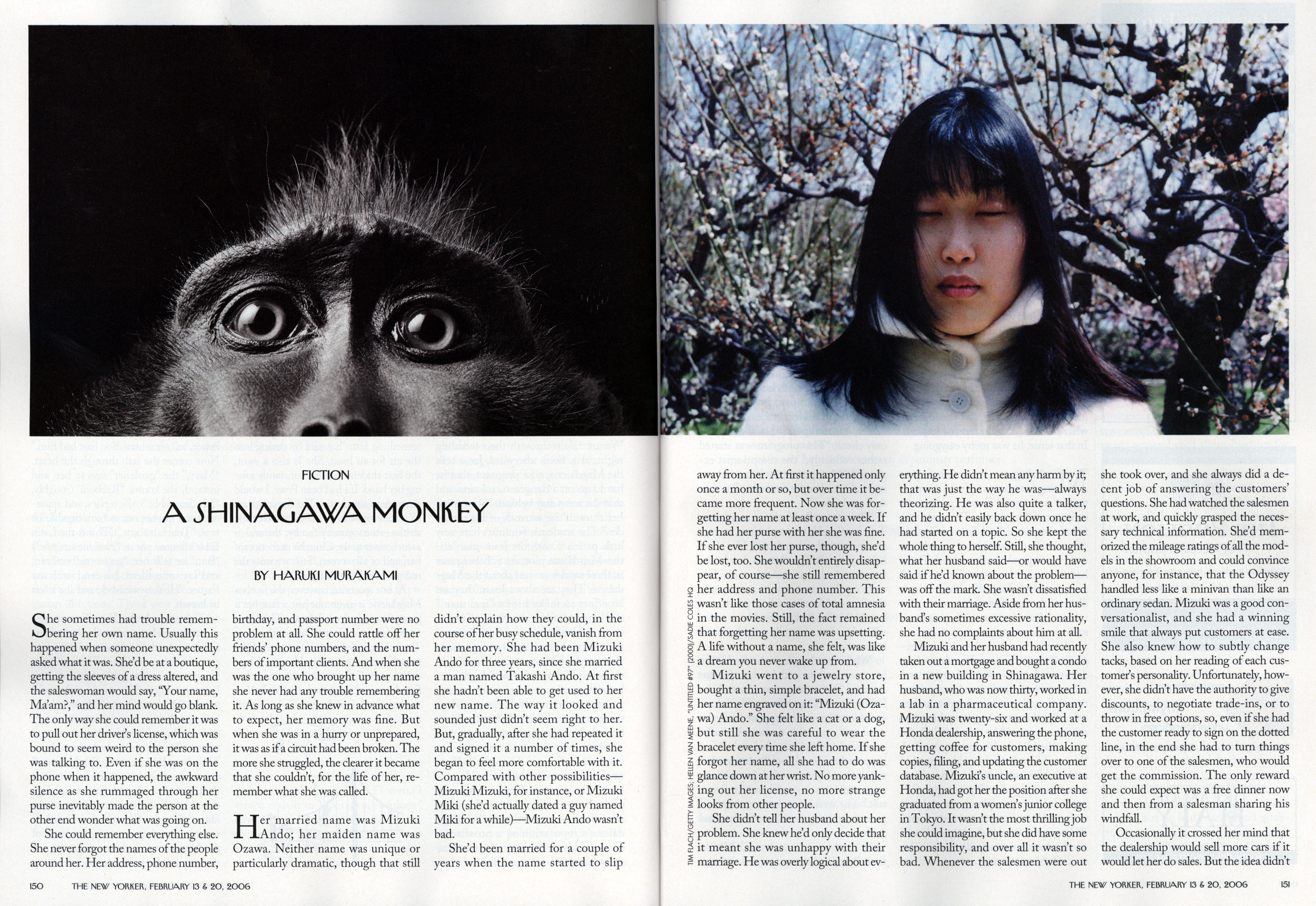 A fiction story by Haruki Murakami is illustrated with a photo by Tim Flach and one by Hellen van Meene. Because the magazine hardly contains photography - it is famous for its cartoons - the two photos feature quite prominently.
